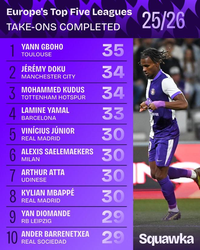 图卢兹前锋格博霍在本赛季12场法甲斩获3球1助攻,据统计,他还完成35次过人,力压多库、库杜斯等人,排在欧洲五大联赛首位。